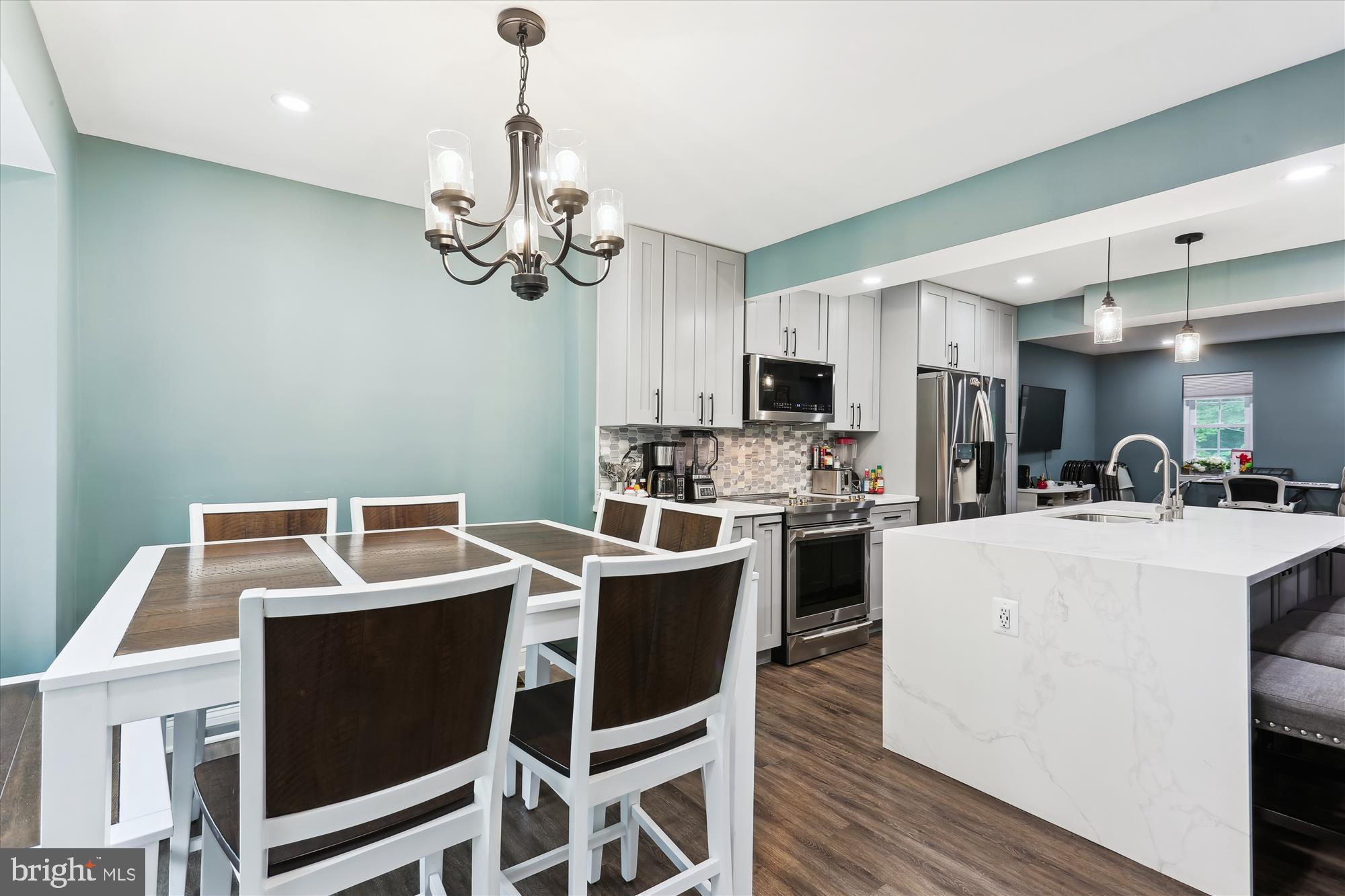 The chef's kitchen is the heart of the home, expertly designed with a double-face island, high-end, energy-efficient stainless steel appliances equipped with WiFi connectivity, sleek quartz countertops, custom cabinetry, and a spacious island perfect for entertaining.